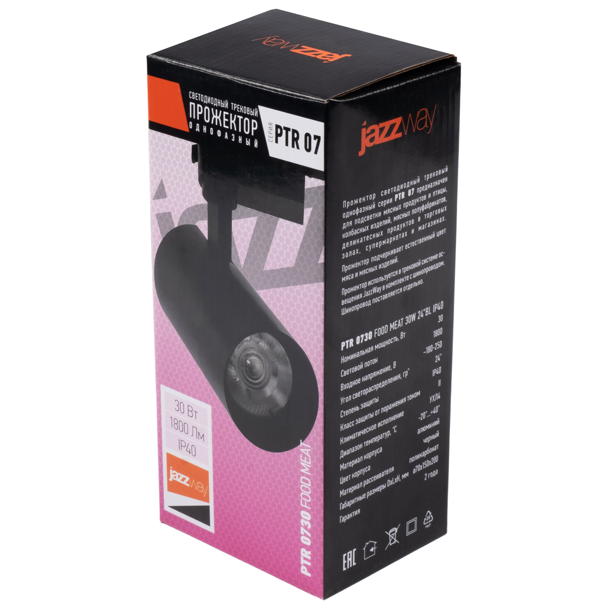 - Светильник светодиодный интегрированный PTR 0730 FOOD MEAT имеет розоватый цвет свечения, который придает мясу аппетитный и привлекающий внимание вид для покупателей.