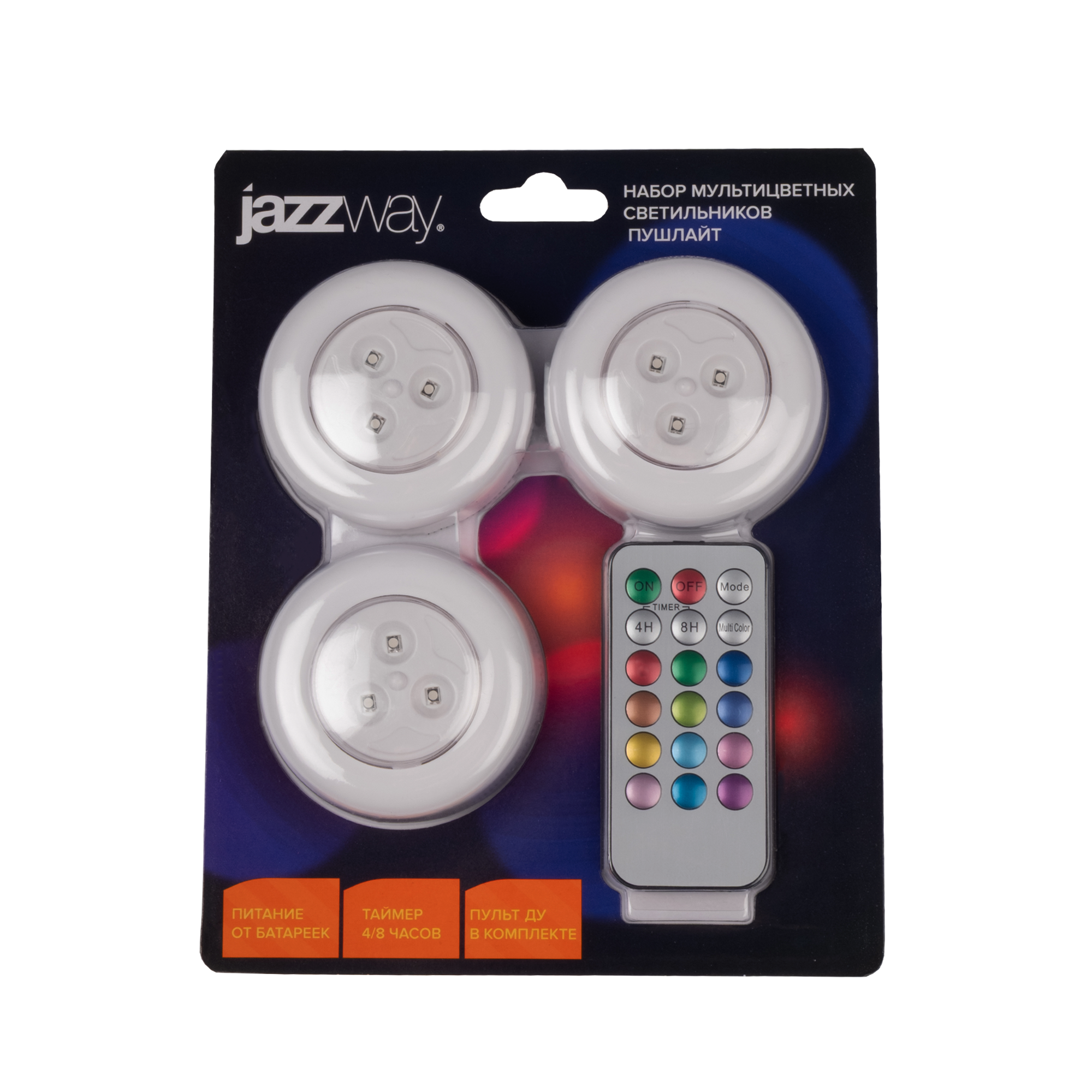 Набор мультицветных фонарей-светильников пушлайт с пультом ДУ Предназначены для использования в качестве дополнительного или декоративного освещения. Можно устанавливать в спальных и детских комнатах, гардеробных, кухонных и стенных шкафах, на барных стойках. Включение / выключение / переключение режимов происходит нажатием на корпус (5 вариантов цветного свечения. Пульт ДУ дублирует функции нажатия на корпус и добавляет еще несколько режимов работы (таймер на выключение, 12 цветных вариантов свечения, режим автоматической смены цветности и др.) Яркость белого свечения 60 люмен, цветовая температура 6500 – 7000 К Дальность действия пульта ДУ 5 метров, угол 160 градусов. В комплект поставки входит лент-липучка, которая позволяет закреплять светильник на гладких поверхностях, пульт ДУ укомплектован батарейками CR2025.